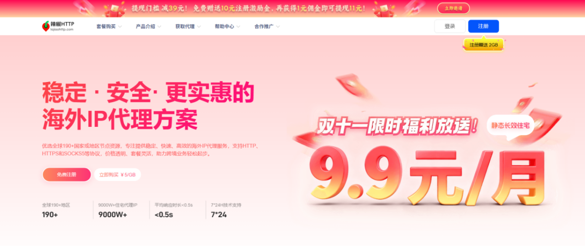辣椒HTTP是一个稳定、安全、合规、更实惠的海外IP代理方案。辣椒HTTP优选了全球190+国家或地区9000W+IP资源,专注于提供稳定、快速、高效的海外IP代理服务,特别是在美国、英国、日本、韩国、新加坡等主流市场拥有大量原生住宅IP资源,能有效帮助用户实现本土化运营、提升访问成功率。