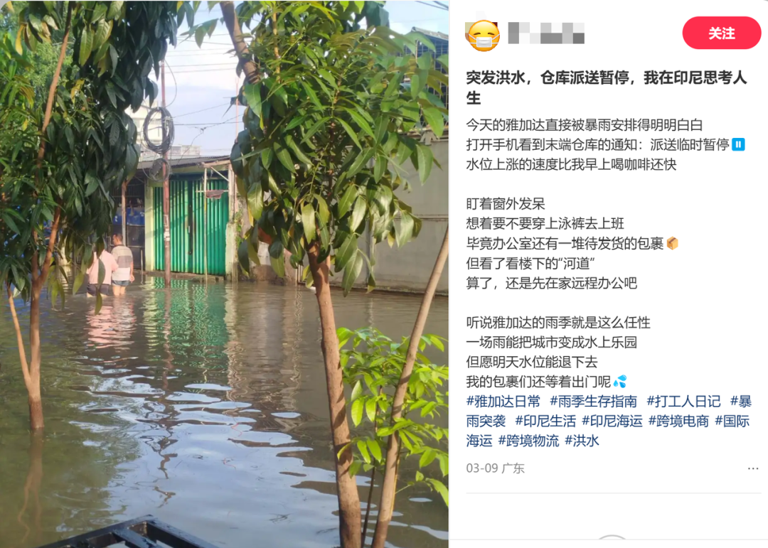 根据通报,此次印尼洪灾影响范围较广,玛琅市因排水沟和河流排水量同步增加,21 处地点发生洪水,雅加达等核心城市更是出现水位快速上涨、末端仓库派送暂停的情况,有卖家反馈 “仓库爆仓、包裹无法发出,只能远程办公”,部分地势较低的仓储物流点受影响直接停工,港口运输也因此受到限制,跨境物流全链路运转效率大幅下降。
