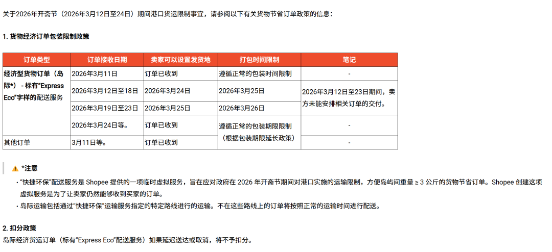 针对斋月假期 + 洪灾导致的物流履约难题,Shopee发布政策,针对不同配送类型订单作出时效顺延安排: