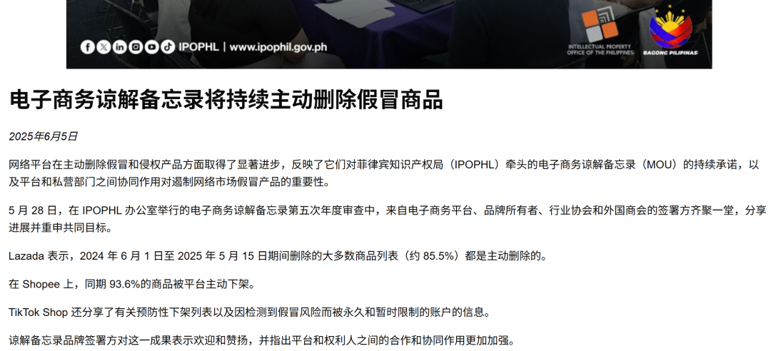 此前,菲律宾知识产权局联合电子商务平台、品牌所有者签下电子商务谅解备忘录(MOU),为线上假冒侵权行为筑起了一道防控屏障。