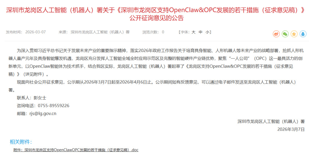 3 月 7 日,深圳市龙岗区人工智能 (机器人) 署发布《支持 OpenClaw&OPC 发展的若干措施(征求意见稿)》,聚焦“一人公司(OPC)”创新单元,为 OpenClaw 发展提供专项支持。政策一出,便在跨境圈掀起波澜。
