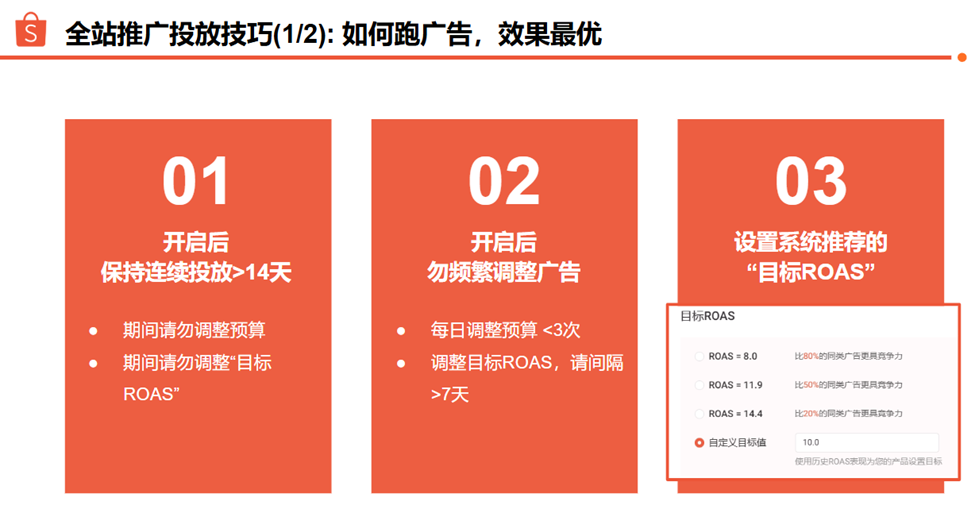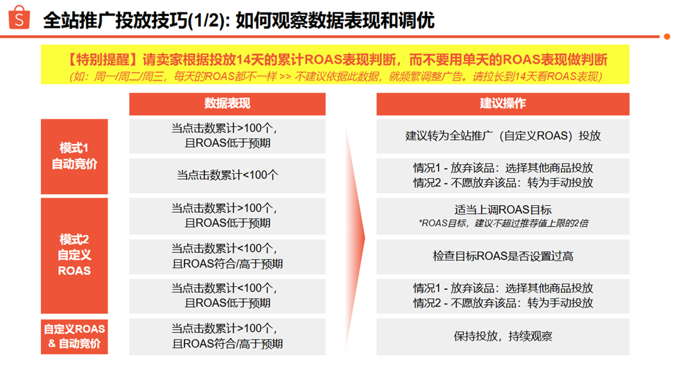 当点击数累计>100 且 ROAS 低于预期:自定义 ROAS 模式可适当上调目标值(不超过推荐上限的 2 倍);自动竞价模式可考虑换品测试。 当流量下降:可降低目标 ROAS 或提高预算,释放更多流量空间;若 ROAS 下降,则反向操作(提高目标 ROAS 或降低预算)。 长期观察指标:忽略单日数据波动,聚焦 14 天累计 ROAS。
