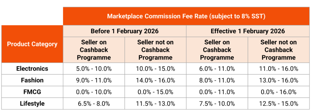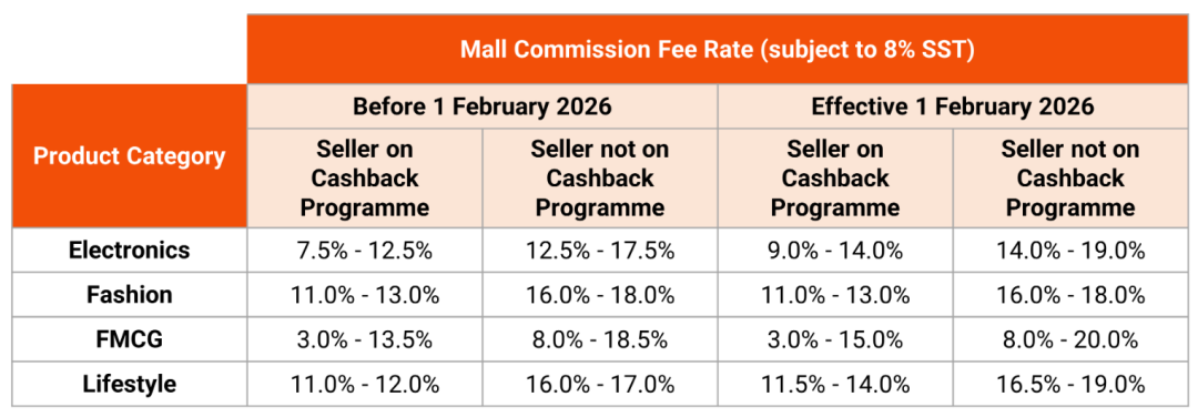 Shopee马来西亚本土店发布最新公告,自2026年2月1日起,对本土站普通店铺、Shopee Mall卖家佣金进行调整,具体金额根据产品类别以及卖家是否参与返利计划而有所不同,最高涨幅达到2%。