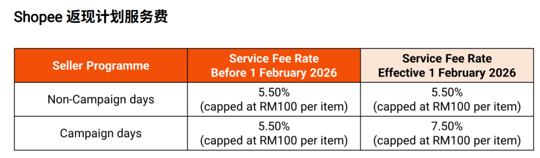 自2026年2月1日起,平台调整返现计划服务费(Shopee Cashback Programme (SCP)),卖家在促销日(包括两位数销售日、月中促销和发薪日促销)期间,需支付 7.5%的服务费(每件商品最高收费 100 令吉)。