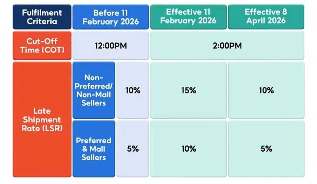 自2026年2月11日起,为了给卖家更多备货、发货的时间,每日截单时间(COT)从中午12:00延长至下午2:00,订单支付截止时间也同步延后到下午2点,交接截止时间的要求则保持不变。