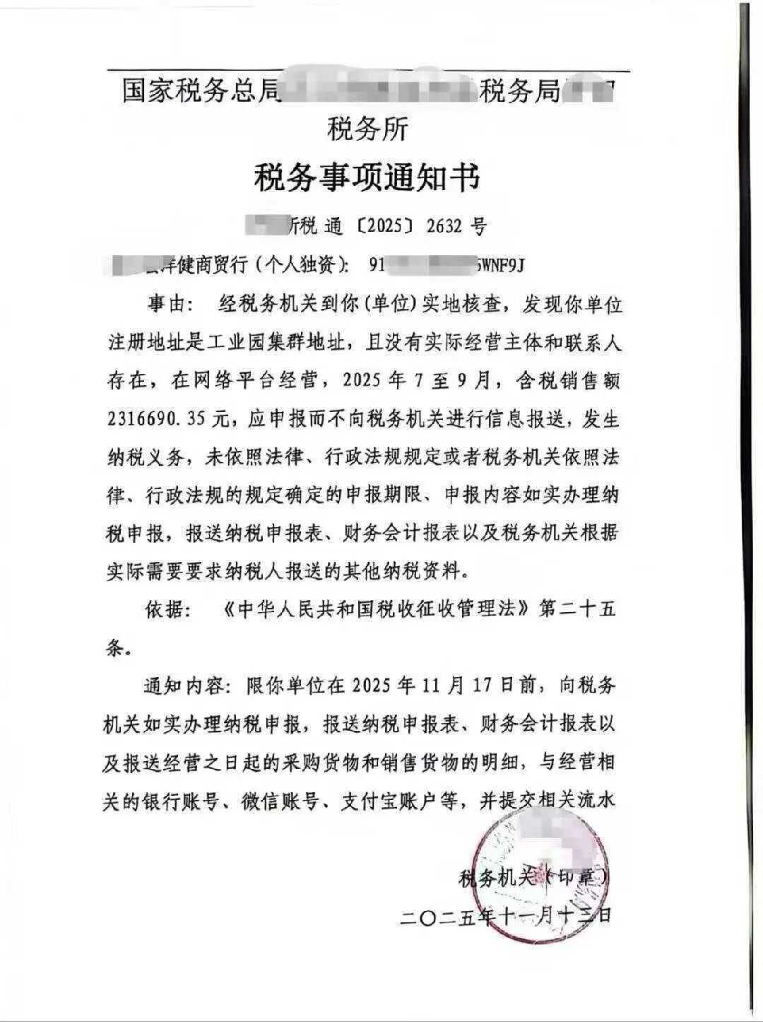 10 月底,补税提示密集推送首批完成报税的卖家收到税务短信,提示三季度申报收入与平台报送数据不一致,需限期更正避免滞纳金。年销售额超 500 万的大卖更收到《税收风险提示函》,直指一般纳税人认定、印花税缴纳等问题。11 月,《税务通知书》传到商家手中。