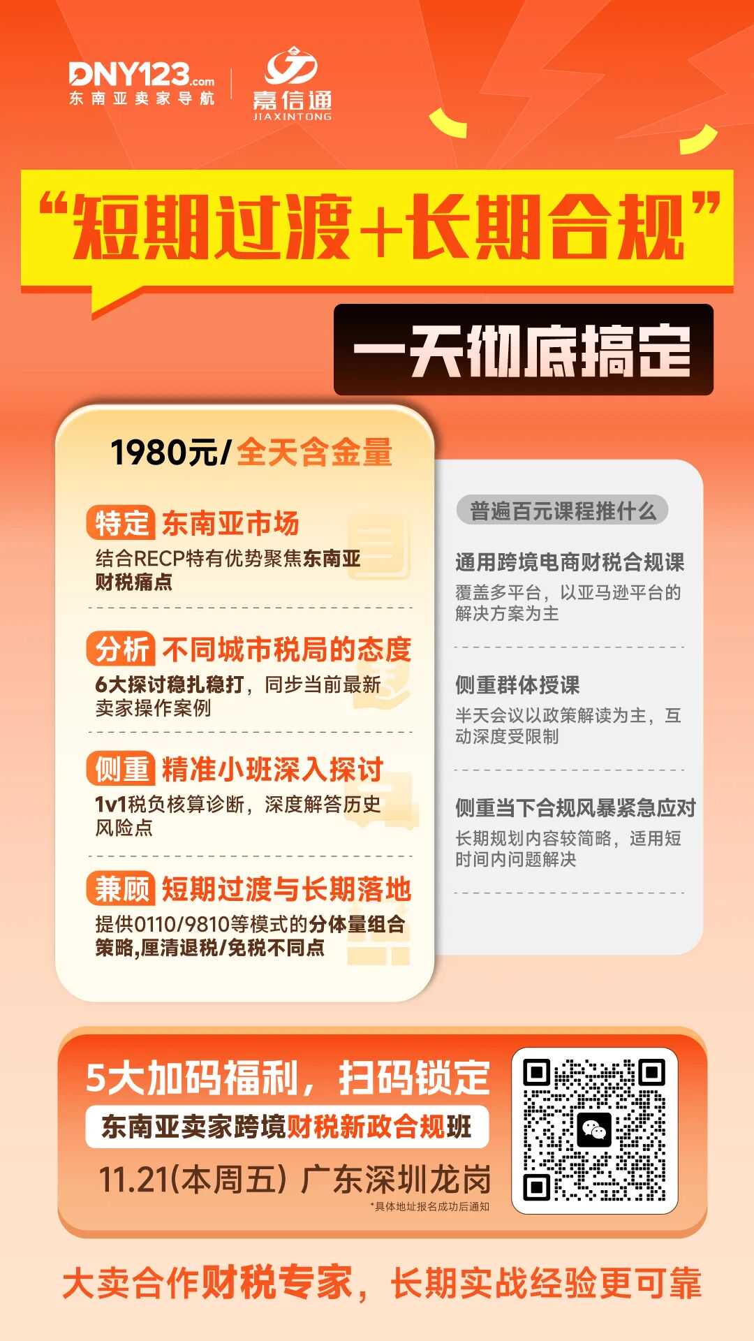 特此DNY123推出了适合东南亚卖家体质的国内税务解决方案以及落地服务专场《东南亚卖家跨境财税新政合规班》。不同于市面上大部分税务都是以亚马逊卖家为基底的解决方案,此次我们将侧重精准小班模式,针对学员在东南亚跨境财税合规方面的个性化问题,如企业自身的税务申报细节、账户架构疑惑等,进行精准的 1v1 指导。