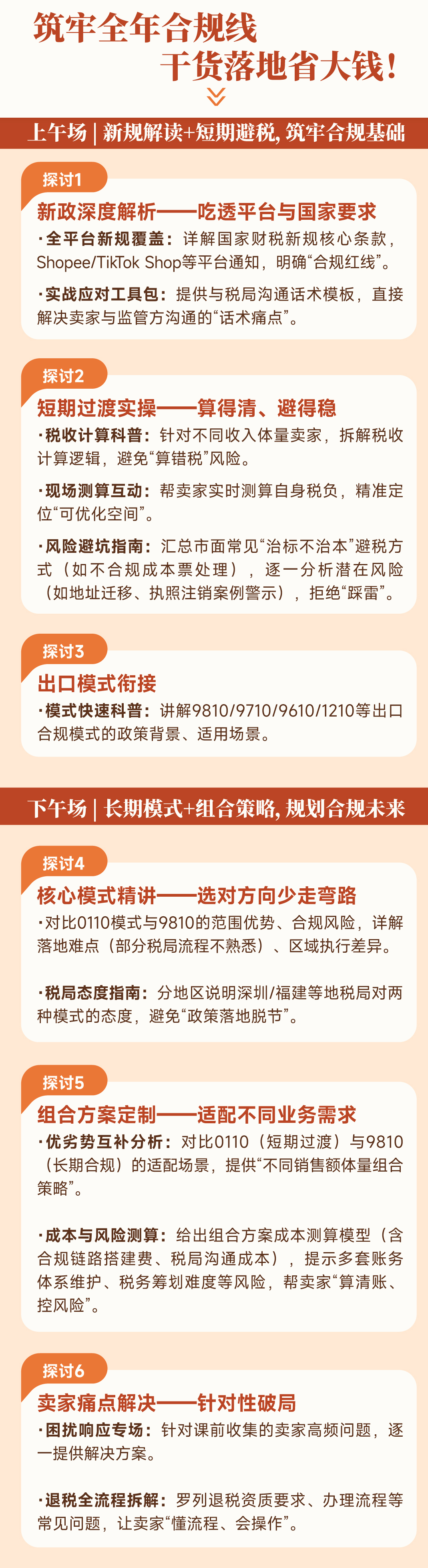在新政深度解析环节,将全方位覆盖 Shopee、TikTok Shop 等平台新规与国家财税新政核心条款,明确 “合规红线”,更提供与税局沟通的 “话术模板”,从此告别与监管方沟通的 “话术痛点”。