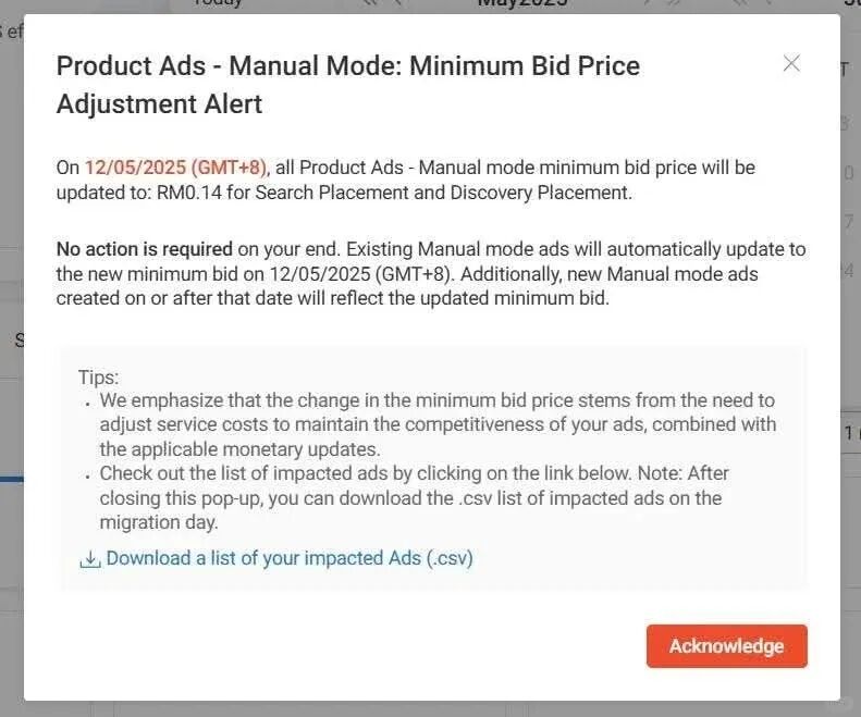 事实上,不仅在个别站点,今年以来马来西亚、新加坡等东南亚电商核心市场的广告预算都在同步跟进调整。例如今年5月,马来西亚本土店卖家曾收到平台官方邮件通知,手动模式的最低出价将上调至RM 0.14,有卖家回忆称,这次调整“相当于直接翻了2倍”。