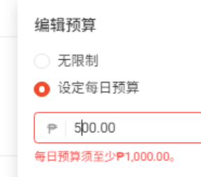 据多个东南亚跨境电商交流群的反馈,有卖家按以往操作设置每日广告预算金额时,突然出现了一行红色小字并提示:“Daily budget must be at least ₱200.00”(每日预算必须至少为200菲律宾比索),更有卖家被提示最低预算不得低于1000菲律宾比索。