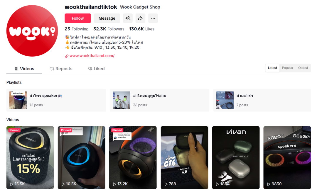 其中泰国站点的TikTok账号“@wookthailandtiktok”已积累粉丝3.2万,日常运营中每天分时段开启4场直播,均采用主播不出镜的模式,内容侧重3C配件品类的展示与讲解。