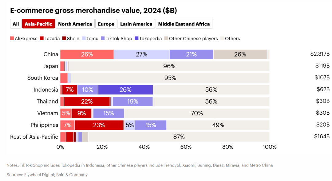 如今,中国电商企业正以惊人的速度在全球范围内布局,贝恩公司最新研究报告指出,在印尼、泰国、菲律宾等东南亚核心市场,Lazada、TikTok Shop等中国电商平台,已狂揽约 50% 的在线零售份额。这意味着,每两个东南亚网购订单中,就有一个流向中国跨境电商平台。