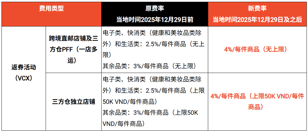 Shopee跨境店发布最新通知,为了持续提供优质的服务与资源,更好地支持多元化卖家群体,自2025年12月29日(当地时间)起,平台将对越南站点返券活动(VCX)服务费进行调整,以保障生态的健康发展。具体如下: