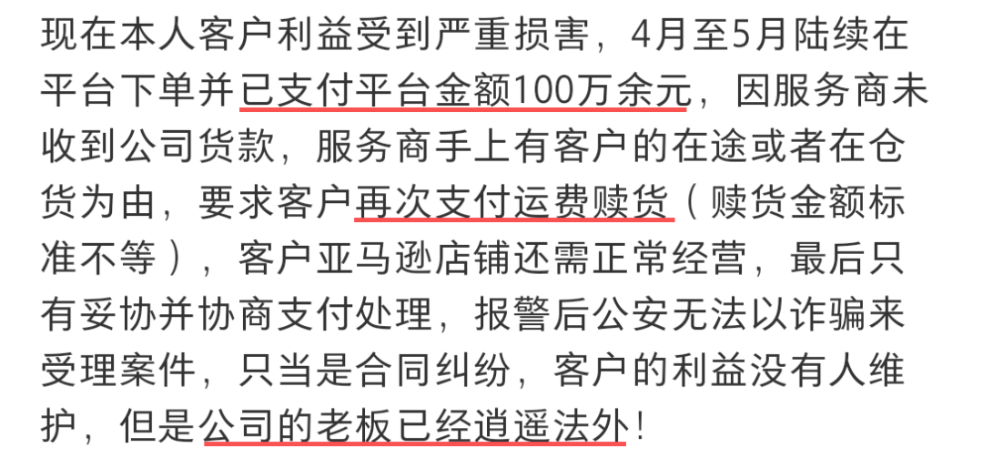 如今一夕之间员工解散、法人疑似卷款跑路等的负面消息,在行业内迅速发酵,只留一地血泪控诉。有卖家支付的百万元货款打了水漂,货物还不知去向;更有卖家货物被滞留,竟被服务商开价三倍运费来“赎货”。