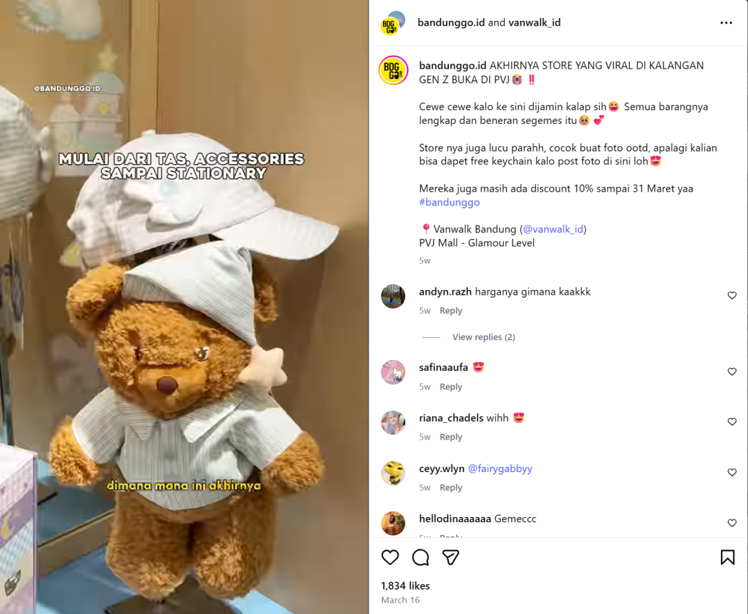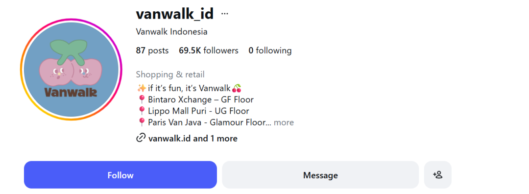 除了面向全球受众的综合官方账号 @vanwalk.official,Vanwalk 重点在印尼、菲律宾等核心市场推进本土化内容运营。其中,印尼站点的 Instagram 账号 @vanwalk_id 已积累 6.9 万粉丝,通过线下门店开业主题内容,高效将线上热度导流至线下到店流量。
