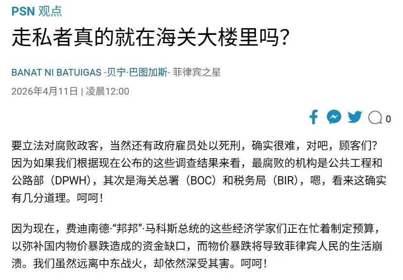 几天前,4月11日,菲律宾《星报》一篇评论文章的标题像一记耳光:《走私者真的就在海关内部吗?》文章没有点名,但字里行间都在追问一件事:为什么海关署长上台后大力反腐,严禁收贿、强制披露与报关行的利益关联——结果却是高层官员纷纷辞职?内部行政副局长费尔明走了,理由是"个人和安全原因";又一位"高层官员"走了,原因不明。改革的方向是对的,人却跑了。