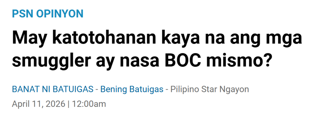4月11日,菲律宾星报记者发表一篇名为《走私者真的就在海关内部吗?》的评论文章,犀利指出海关局内部疑似存在官员与走私集团勾结的现象。