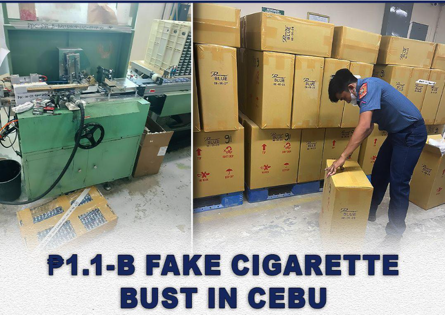 同一天,执法部门持搜查令突袭了宿务拉普拉普市Basak园区的一处仓库,现场缴获贴有伪造税票的烟草制品以及生产设备,价值超过 11 亿比索,4名中国籍员工和1名菲律宾籍员工被当场带走。