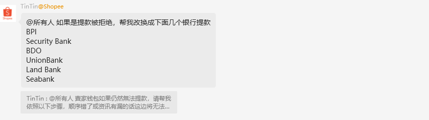 紧接着,Shopee客服进一步提示,如果卖家遇到提款功能受限,需更换指定银行账户(如 BPI、Security Bank、BDO 等)。