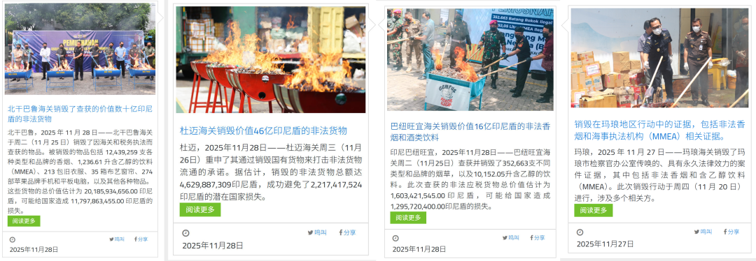 11月末,印尼海关总署密集发布多条通告,该国多地海关部门针对缴获的非法货物展开集中销毁,在表达印尼政府打击非法进口强硬态度的同时,给违规从业者一个“下马威”。例如北干巴鲁海关销毁的物品包括香烟、含酒精饮料、旧衣服、布艺窗帘、苹果手机以及其他各种物品,货物的总价值估计为 201.86 亿印尼盾,可能给国家造成 117.98 亿印尼盾的损失。