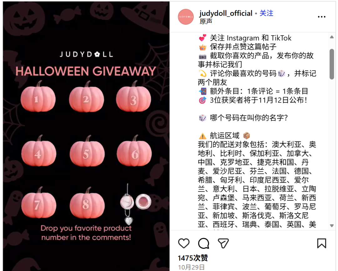 例如万圣节前夕,品牌通过Facebook、Instagram等社交平台发布抽奖活动,借助节日热点与奖励机制,鼓励用户在评论区积极互动,同时发帖分享最喜欢的产品及使用体验并标记品牌方与好友。这一形式成功调动用户参与热情,单条活动帖便收获 1475 条评论,沉淀了大量真实 UGC 内容与品牌互动数据。