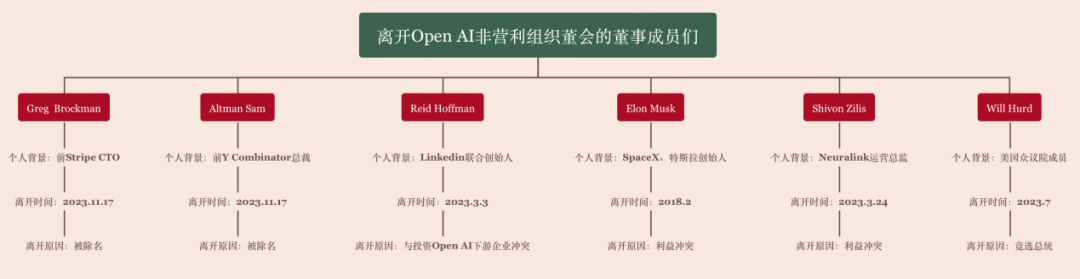 根据不完全统计,算上 Altman 和 Greg,已经有六位董事或主动或被动地离开了 Open AI 的董事会,离开原因大多是利益冲突。Open AI 发布的官方通告中,把 Altman 除名归结为对董事会的不坦诚。